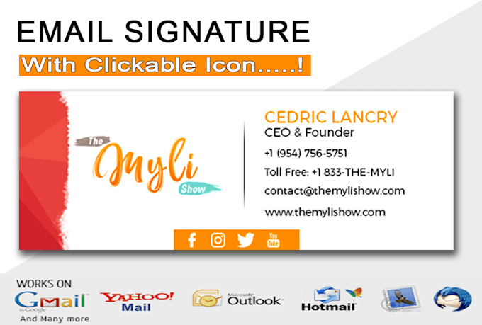 Gmail, Outlook, Office 365, Hotmail, Yahoo, MAC Mail, Thunderbird, RoundCube, Zoho Mail, Windows live, horde, iPhone, Web Mail and many more html email signature supported clients.